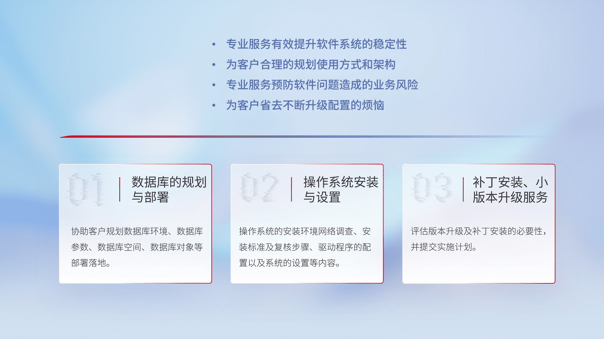 为客户提供软件规模升级、、、、快速部署、、、、按需配置的专业服务,,从数据库的规划与部署到操作系统的安装与设置,,,,再到补丁安装和小版本升级提供支持。。。